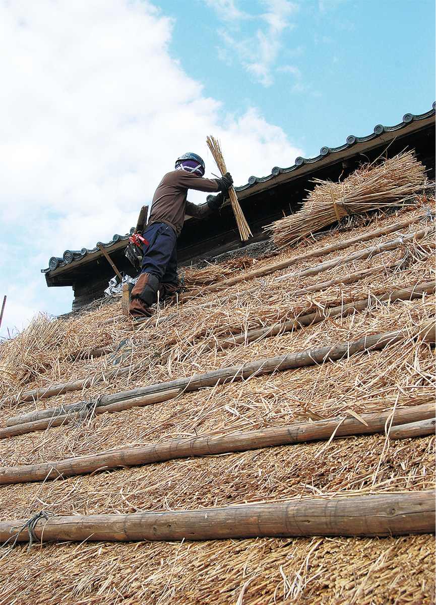 「カヤは軽くて長持ちする。空気を含むため夏でも涼しい」と話した飯田さん。「貴重な文化財でもあるので、長く残していけたら」と屋根を見上げていた。