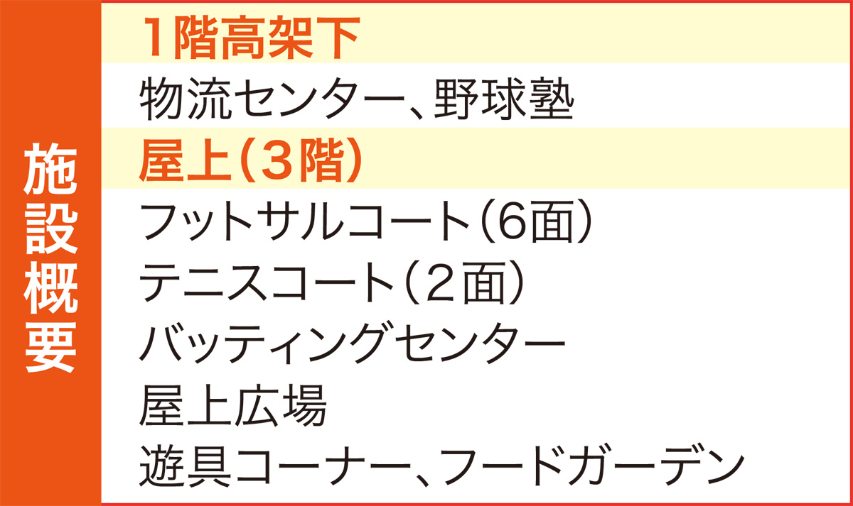 ラグビーW杯や東京五輪・パラリンピックの開催を控える中、横浜にはグラウンドが少ないことから、スポーツ施設のテナントを誘致。フットサルコート・テニスコートが整備され、バッティングセンターや野球塾も開業。また同社が運営するフードガーデンも併設され「スポーツ」と「食」を通して地域の健康を支援する。「体を動かし、地域の人々と交流できる場所になれば」と同社担当者は話す。