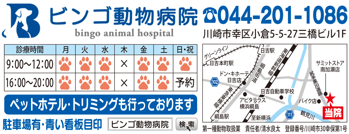 港北区からも程近い川崎市幸区のビンゴ動物病院は、「気軽に立ち寄り、些細なことも相談できる動物病院」をモットーに、イヌ、ネコ、ウサギの診療や健康診断を行う。
