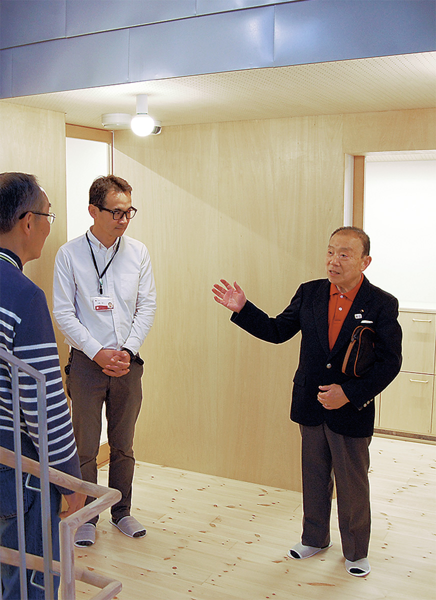 施設内を見渡した大豆戸町内会の篠崎元彦会長=写真右=は「とても夢のある建物。子どもたちは充実した保育を受け、幸せになってほしい」と期待を込めた。