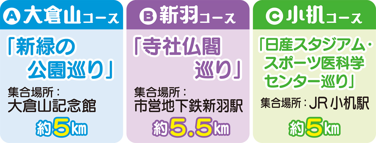 コースは(A)大倉山コース〜新緑の公園巡り(約5Km)/大倉山記念館集合(B)新羽コース〜寺社仏閣巡り(約5・5Km)/市営地下鉄新羽駅集合(C)小机コース〜日産スタジアム・スポーツ医科学センター巡り(約5Km)/JR小机駅集合――の3つ。いずれも午前9時30分受付で10時スタート。(C)コースは「日産スタジアム見学ツアー」「ウォーキングのためのミニ講座」を含む特別コース。
