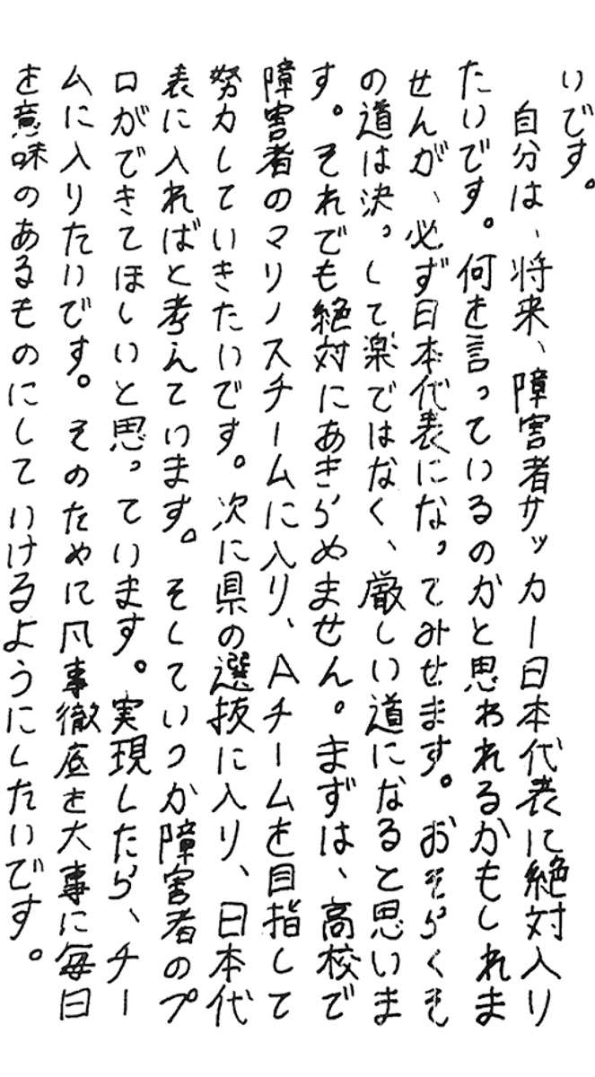 高校進学時、障がい者サッカーの日本代表になりたいとの目標を掲げ、Jリーグ初の知的障がい者サッカーチームである横浜F・マリノスフトゥーロに入り、チーム練習に通いやすく、発達障がい教育の先駆けでもある同学園に入学。担当教諭によれば「朝は誰より早く来て、教室の片付けなど手伝い、テスト勉強も手を抜かない生徒」だという。サッカーについてもストレッチや練習ノート記入を欠かさないとも。