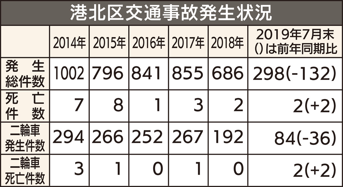 港北警察署によると、区内で7月末までに発生した交通事故件数は298件。前年同期比で132件減と、2017年から減少傾向にある。同署は、街頭での啓発活動や交通安全教室などを実施。安全・安心の街づくりへの活動が実を結びつつある。
