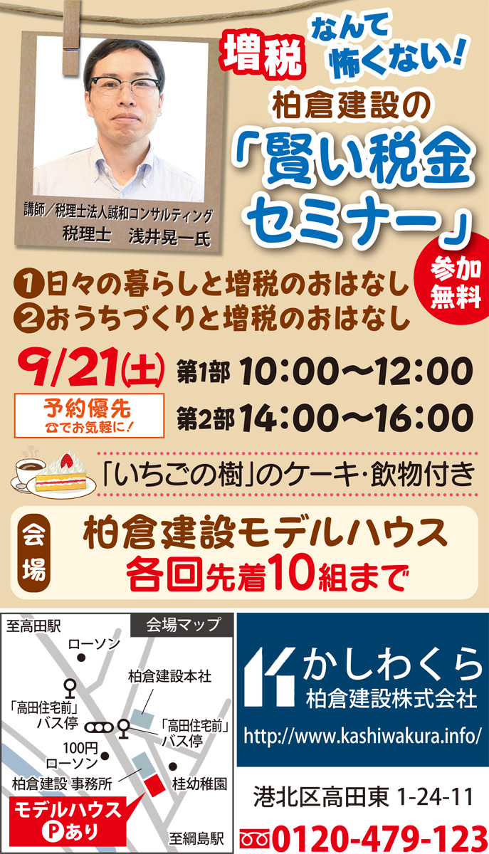 創業26年、高田東の工務店「柏倉建設(株)」では、同社モデルハウス内で「賢い税金セミナー」を9月21日(土)に開催する。講師は税理士の浅井晃一氏。時間は【第一部】午前10時〜【第二部】午後2時〜。参加無料。内容は【1】「日々の暮らしと増税のおはなし」…何が8%で何が10%なの?軽減税率について【2】「おうちづくりと増税のおはなし」…贈与税非課税枠の拡大、すまいの給付金、印紙税法など増税によって家づくりがどうなる?など。最後に個別で相続税相談や質疑応答も受け付ける。