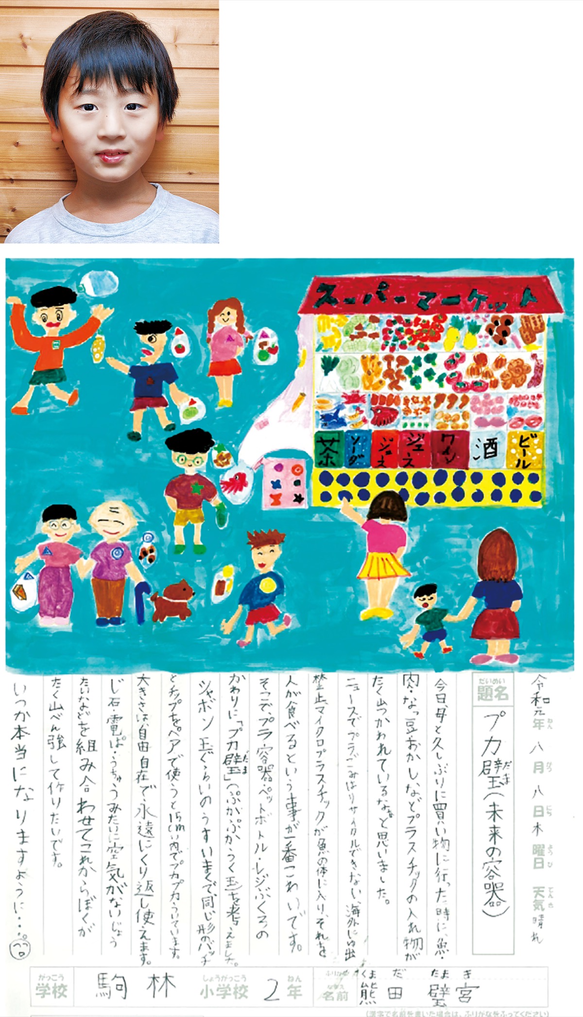 市立駒林小学校2年の熊田璧宮さん=左写真=は(株)ニックス賞を受賞。ニュースでビニールゴミが環境に与える影響を知り、「プカ璧(未来の容器)」を考えた。