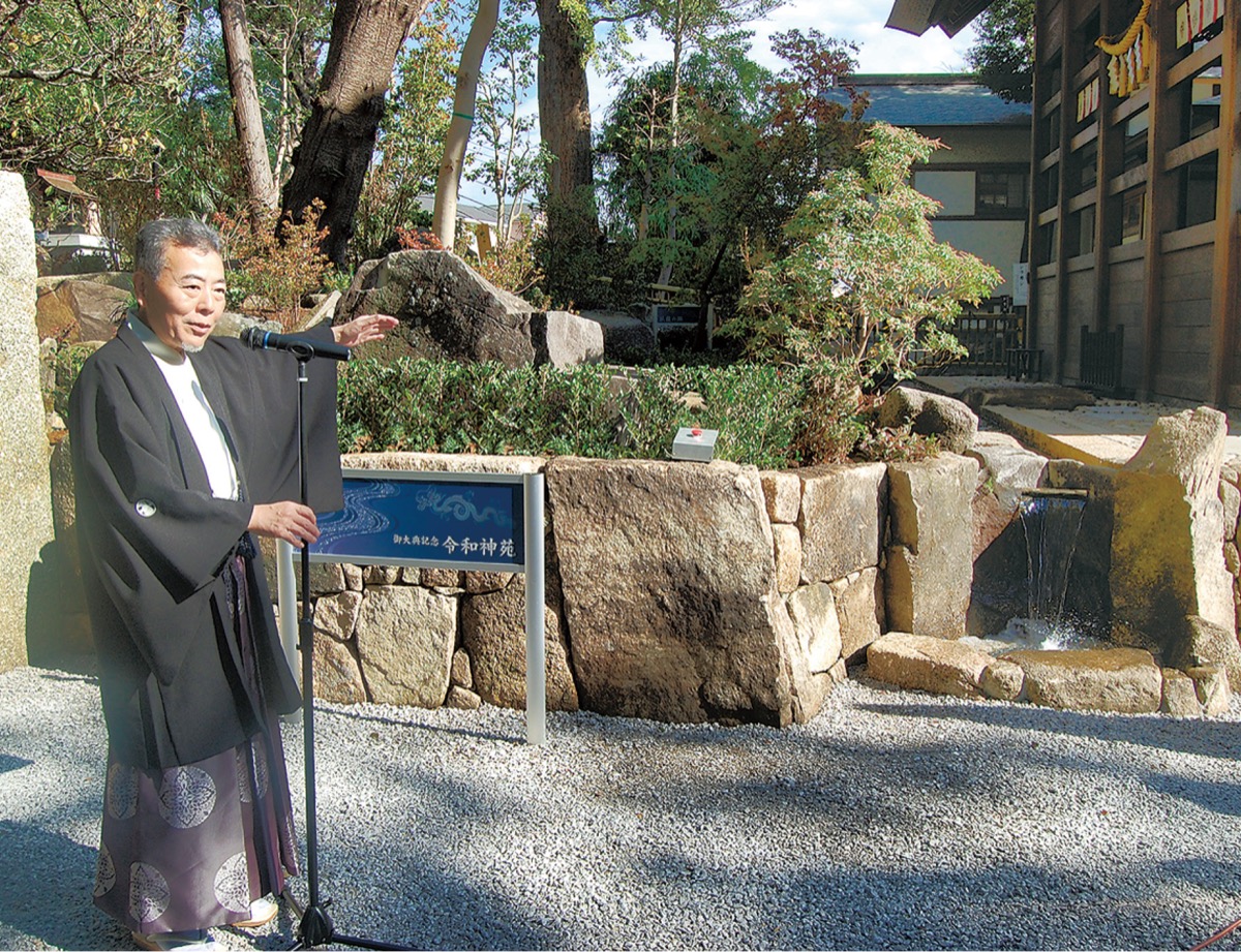 天皇陛下の即位に伴う皇室行事「大嘗祭」に合わせ、この日は同神社で大嘗祭当日祭が執り行われ、祭儀に続く御大典記念境内整備事業竣功奉告祭で約70人の参列者が「令和神苑」の完成を祝った。