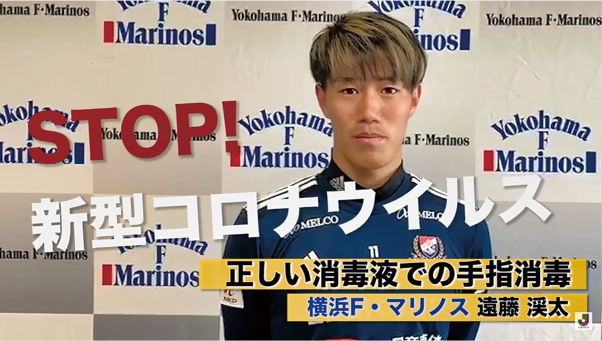 サッカーJ1横浜F・マリノスは、新型コロナウイルス感染拡大防止啓発活動「STOP!新型コロナウイルス」の一環として、選手による「正しい手指消毒」の動画を制作した。また、再開を待ちわびるファンに向け、選手からのメッセージ動画も配信している。