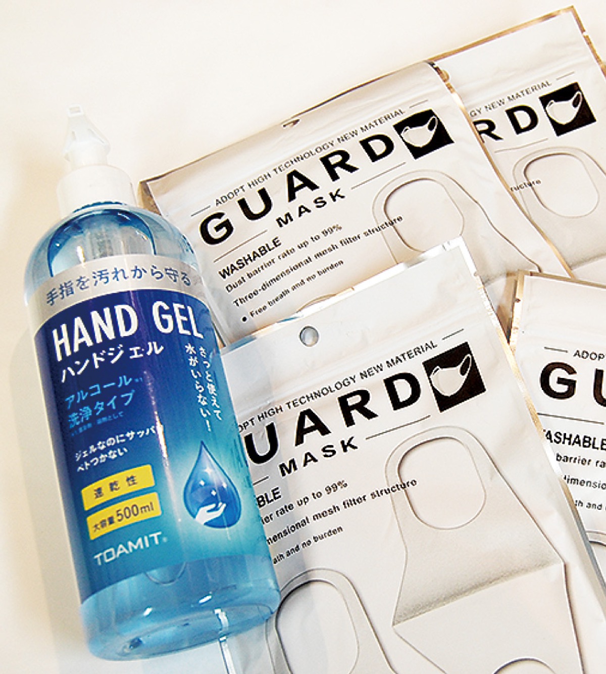 南日吉商店会(小嶋純一会長)では5月3日、「新型コロナウイルスに負けるな」と銘打った取組みの第3弾として、会員58店舗に、消毒用アルコールジェル500ミリリットル入1本とウレタンマスク15枚=写真=を配布した。