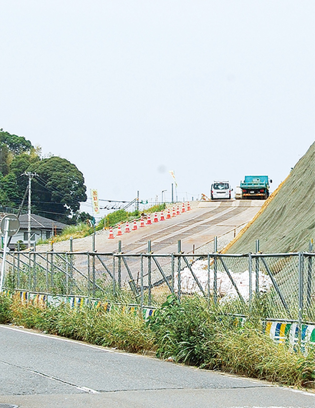 新吉田高田地区では今年度内を目途に、橋梁部と早渕川両岸の河川管理用通路をつなぐ歩行者用スロープ4カ所が整備される予定。新吉田地区では今後、現在設けられている工事用道路や重機搬入用の仮設構台が撤去され、道路部分の掘削が進められる。また、道路脇の法面の整形工事や崩落防止のための補強等も行われる。