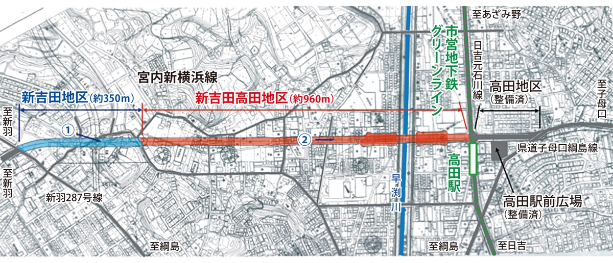 横浜市は現在、都市計画道路・宮内新横浜線の新吉田高田地区・新吉田地区の工事を進めている。新吉田高田地区は、高田西1丁目地内〜新吉田東3丁目地内の約960m、新吉田地区は、新吉田東3丁目地内〜新吉田町地内の約350mで、4車線道路の幅員は歩道を含め22〜25m。3月には新吉田高田地区の本線工事が完了し、歩道の供用が始まった。両地区の開通時期について、市は今年度末までを目標にしている。