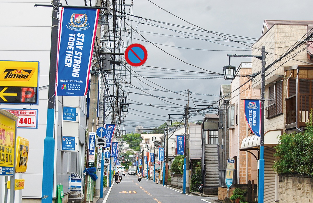 港北区商店街連合会(酒井誠会長)はサッカーJ1、横浜F・マリノスを応援しようと、同クラブの協力のもと、青色を基調としたバナーフラッグ合計約700枚を区内の各商店会に配布し、掲示を始めている。