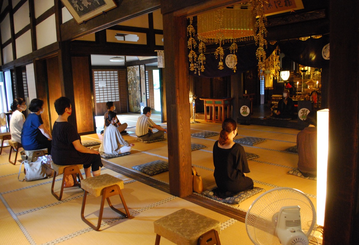 真言宗西方寺(新羽町)では、新型コロナウイルス感染拡大防止のため、毎月行っていた「阿字観瞑想会」「写経会」を一時中断していたが、先月から再開。「新しい生活様式」に則り実施している。「写経会」は、開催時間を、なるべく分散して来場できるよう以前より長く午前10時から午後3時までとし、人数制限も実施。「阿字観瞑想会」も、本堂を広く使い、以前は行っていた瞑想後の茶話会も中止とした。7月25日に行われた瞑想会では、約10人が来場。換気に配慮し、扉を大きく開けた本堂内で皆、静かに瞑想を行う姿が見られた。