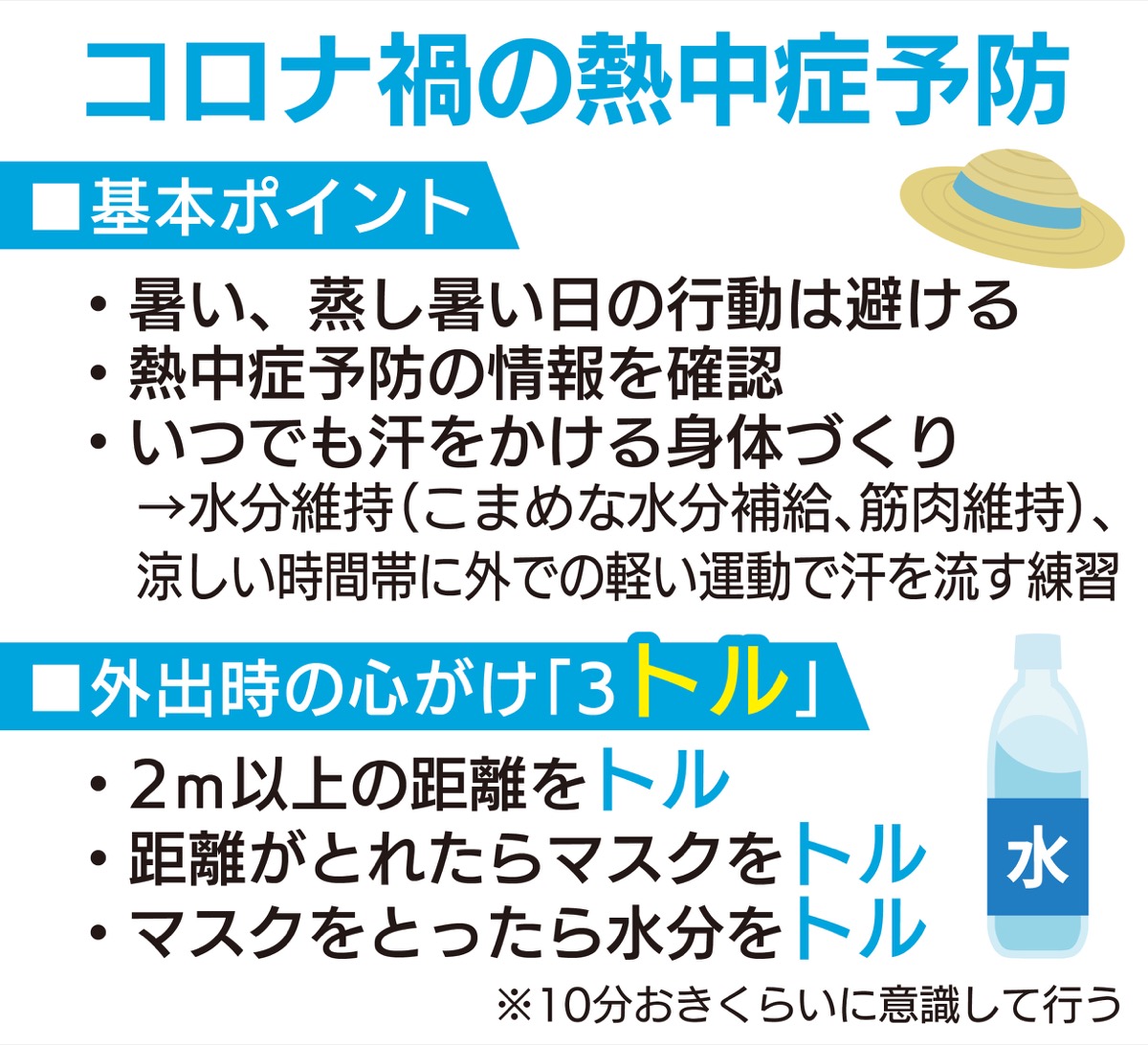 暑い、蒸し暑い日の行動は避ける、熱中症の予防情報などを確認。いつでも汗をかける身体づくりとして、こまめな水分補給や筋肉維持のための運動、涼しい時間帯に外での軽い運動で汗を流す練習をすることなども提案する。さらに、コロナ禍の熱中症対策として「3トル」を提唱。ソーシャルディスタンスとして2m以上の距離を「トル」、距離が取れたらマスクを「トル」、そしてマスクをとったら水分を「トル」だ。