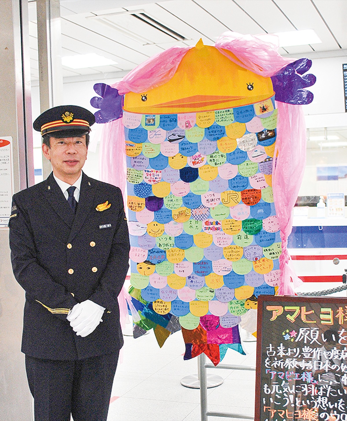 同駅によれば、緊急事態宣言下では特に「駅の乗降客は少なく、駅自体の雰囲気が暗かった」という。そこで「お客様に明るいメッセージを届けたい」と、疫病退散の伝説のある妖怪「アマビエ」と、JR東海のICカード「TOICA」のイメージキャラクターであるヒヨコを組み合わせた装飾を企画した。体にはJR東海のグループ会社8社の職員から集めた約250人分のイラストやメッセージをウロコに見立て、張り付けてある。その内容は、疫病退散を願うものや旅の無事を祈るもの、新幹線のイラストなど様々だ。