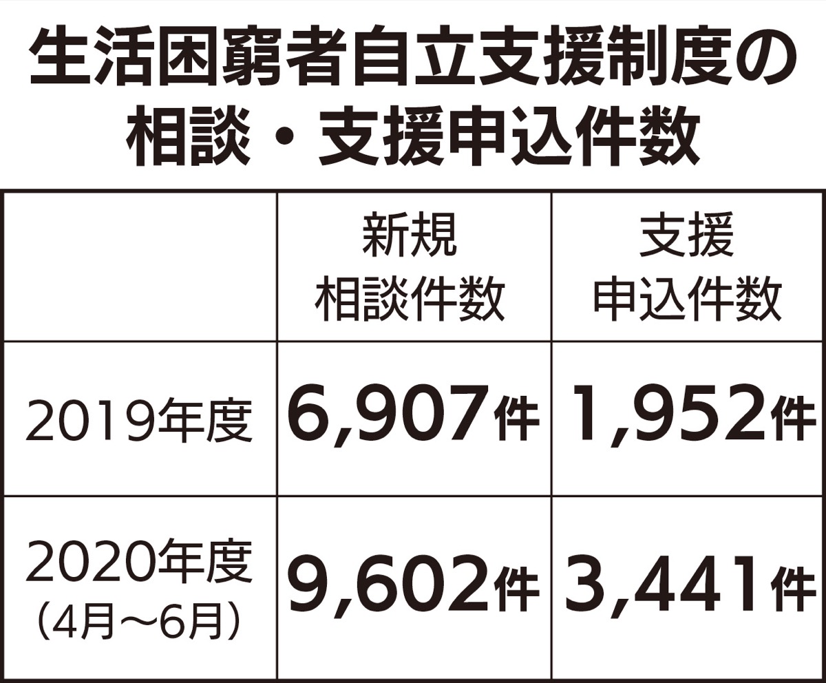 元々、住居確保給付金は離職により住居を失った人、または失う恐れがある人が就職活動を行うことを条件に支給していたが、コロナ禍を受けて今年4月に要件を緩和。コロナの影響で仕事が減った自営業やフリーランスの人も対象になり、相談全体の中でも住居確保給付金の希望が圧倒的に増えた。また、就労に関する相談も継続的に多く、市の担当者は「今回の急激な増加は生活に困っている人と早い段階でつながれた機会だと考えている。給付して終わりではなく、必要であれば就労や家計改善など更なる支援につなげることが大切だ」と話す。