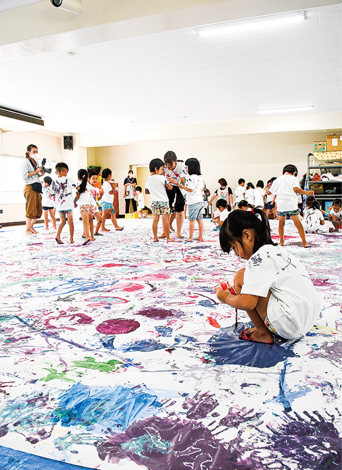 新型コロナの影響でお泊り保育や盆踊りなどの催しが中止になっていることを受け、同園の園長や教諭らが企画した。園児らは巨大な紙に絵を描いたり=写真=、宝探しに挑戦したり、非日常の体験を楽しんでいた。