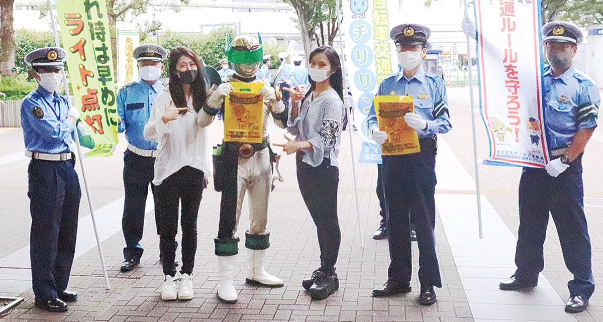 秋の全国交通安全運動に合わせて毎年恒例となっている同キャンペーン。例年は”事故なし”にちなんで、梨の入った啓発グッズをドライバーらに配布する形式で実施。しかし、今年は新型コロナ感染防止のため、梨の代わりに除菌シートの入った啓発グッズを歩行者に手渡した。太刀野一夫署長をはじめ、ご当地ヒーロー「横浜見聞伝スター☆ジャン」らが約300部を配布し、交通安全を呼びかけた。