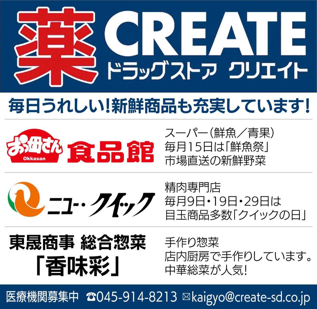 駅近で、駐車場も35台分用意(買い物・診察で30分〜90分無料)。「ワンストップで何でも揃うのが強み」と話すのはクリエイトS・Dの草刈佑介店長。「お客様の声を取り入れた売り場づくりに力を入れ、扱っていない商品も柔軟に対応しています。目指しているのは感じの良さで地域1番店」と笑顔を見せる。
