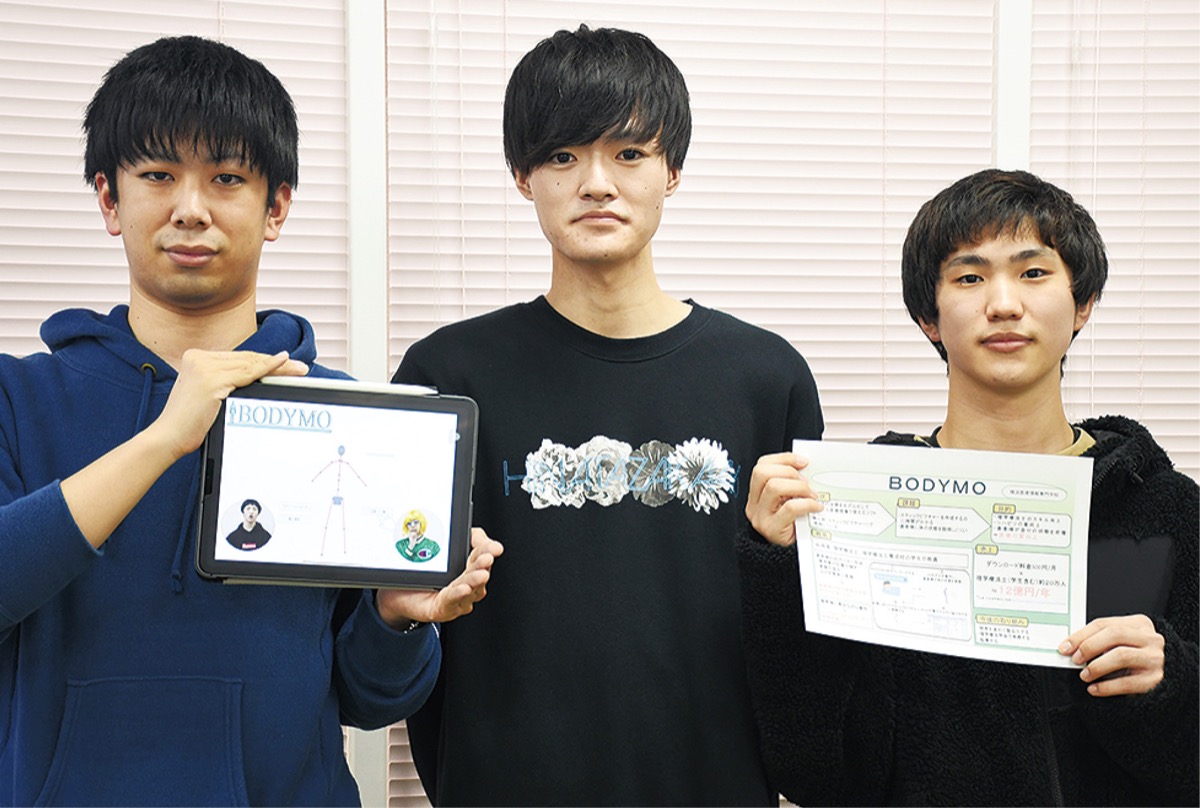 受賞したのは、医療IT科2年生の赤坂真冬(まふゆ)さん、中村弘希さん、渡邉佑恭(うきょう)さんが開発した「BODYMO(ボディモ)」。同ツールは、リハビリ現場で医師などが症例報告をする際、患者の体型を図式化して表現する「スティックピクチャー(棒人間)」の作成を支援するもの。3人は、医療現場にスティックピクチャーを作成する専用ソフトが無いことに着目し、BODYMOを開発した。同ツールを使えば業務効率化につながるほか、図を患者に見せながらの診療も可能となる。