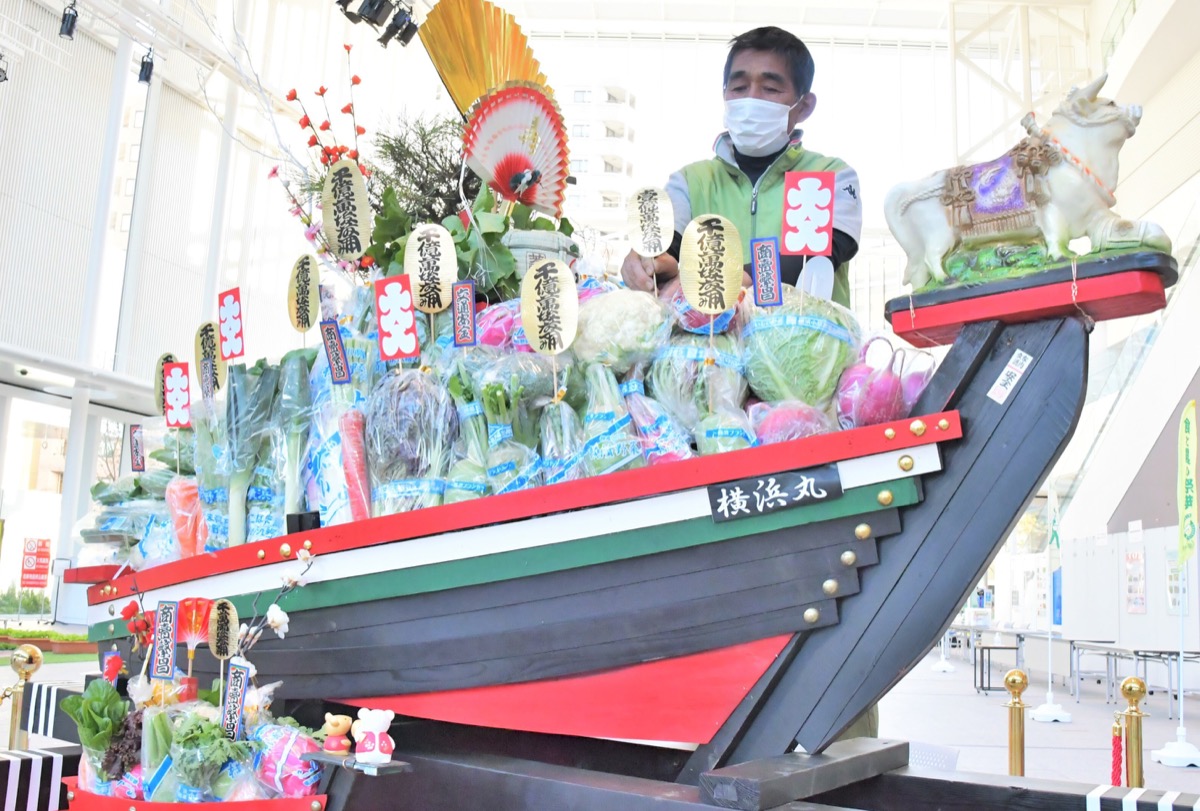 小机町で農家を営む松本勝彦さんが収穫した野菜で制作した「宝船」が11月5日、横浜市役所1階のロビーに1日限定で飾られた。