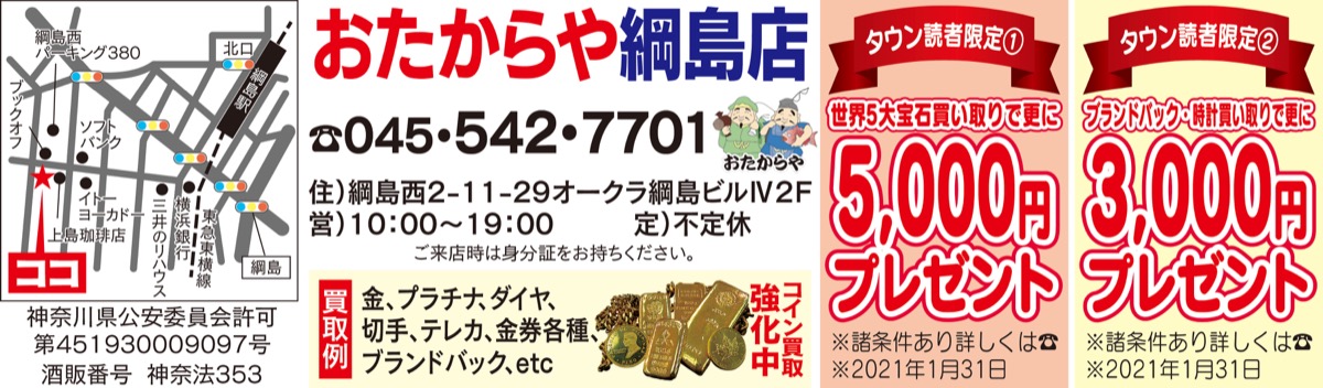 「ヨーカドーそば、ブックオフ前」のおたからや綱島店。コロナ禍で外出を敬遠する人も少なくない中、同店では”出張買取”を強化中。「掘り出しものが見つかった」「持ち運び不要なので、重さや大きさを気にしないですむ」といった声も上がっている(コロナ対策徹底)。即日対応のため気軽にお【電話】を。