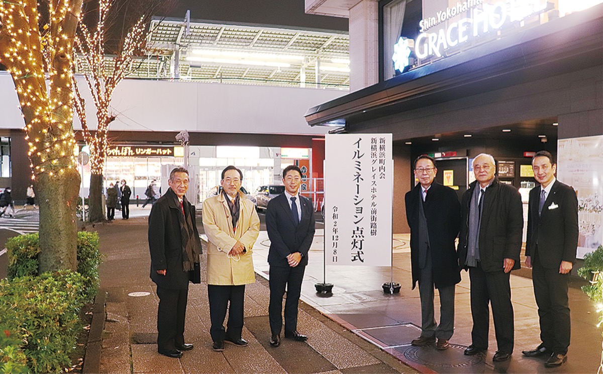 新横浜グレイスホテル(岩井昌弘総支配人)は12月8日、同ホテル前の街路樹イルミネーション点灯式を行った。
