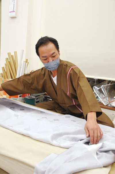 鈴木さんは曾祖父の代から和裁をなりわいにする家系に生まれ、現在、有限会社衣裳研究会(神奈川区神大寺)で代表を務める。高校卒業後に香川県の原和裁研究所で5年間の修行を積んだ。全国から和裁士の卵が集まる中、男性は鈴木さんただ一人という環境の中、23歳の若さで最難関の1級和裁技能士資格を取得した。5年間で身につけた技術や心得は、今でも着物作りの素地になっているという。