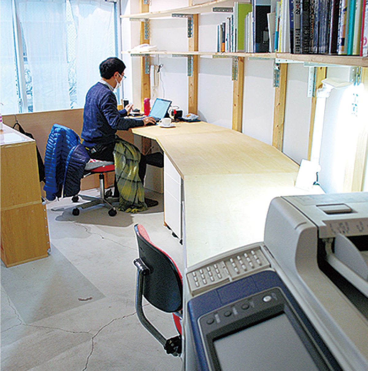 妙蓮寺駅前にある石堂書店2階に昨年2月オープンしたコワーキング・シェアオフィスは「本屋の二階」。「地元で働く人を増やし、地域を活性化したい」という狙いで地元企業等により開設された場所だが、前回および今回の緊急事態宣言後には、都内への通勤者のリモートワーク利用が増大。オンライン会議など通話が必要な人には、専用個室も作った。個室型のシェアオフィスには、出版社の三輪舎(中岡祐介代表)が入居し、中岡さんが運営の中心を担う。感染対策としては、定員を半分の5人にし、換気や消毒なども徹底しているという。