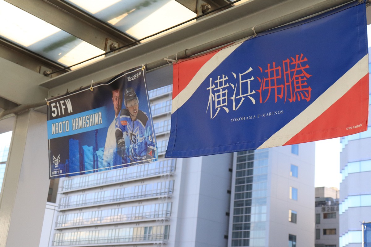 横浜市初のプロアイスホッケーチームとして、KOS新横浜スケートセンターをホームリンクに2020/21シーズンから国内トップリーグに挑戦している横浜GRITS。新たなホームチームを盛り上げようと港北区と港北区商店街連合会は協定を締結し、全選手の顔写真入りの特製フラッグが、新横浜駅ペデストリアンデッキに掲出された。同じく新横浜にある日産スタジアムがホームのサッカーJ1、横浜F・マリノスのフラッグとともに飾られている。港北区はtwitterでその模様を発信し「緊急事態宣言に解除後、新横浜にお越しの際に、両チームのホームゲームにお越しの際に、ぜひフラッグもご覧下さい!」と呼びかけている。
