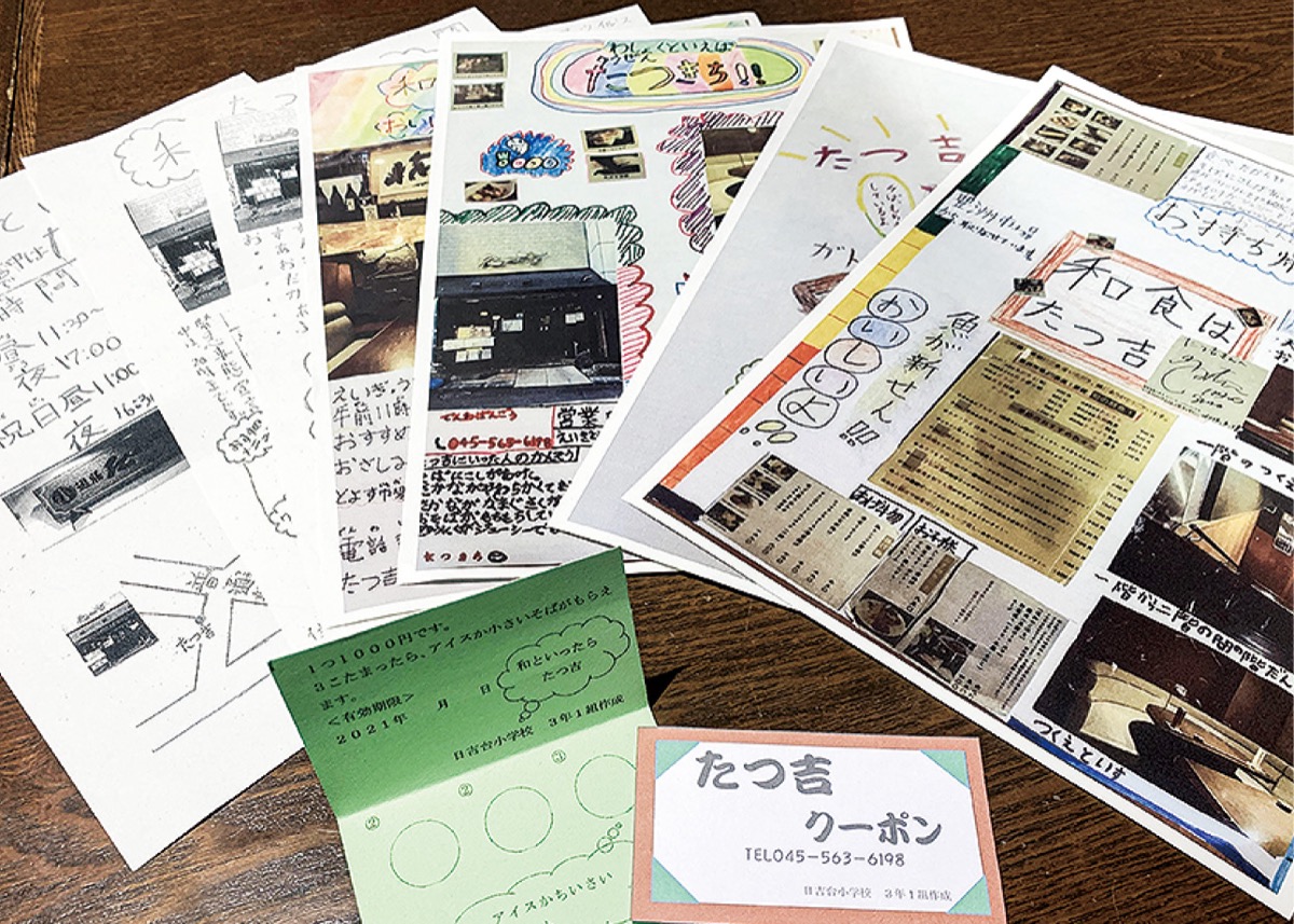 児童らは、同校周辺の和食店やカフェなどに訪問し、店の現状を分析。「お客さんを増やすにはどうしたらいいか」と考え、店側に許可を取ってチラシやクーポンを制作した。制作物を受け取った和食店「遊ZENたつ吉」の島名貴子代表取締役は「スタッフ一同心から嬉しく励みになった」と語り、後日、児童らに感謝状を贈った。