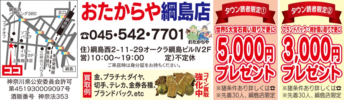 「ヨーカドーそば、ブックオフ前」のおたからや綱島店。オープン2周年を迎え特別キャンペーンを実施中。価格が高騰中の貴金属やブランド品の買い取りで現金プレゼント(下記参照。諸条件あり、詳細は【電話】)。「地域の皆様の支えのおかげ。来店はもちろん、出張も承るのでお気軽にどうぞ」と高田代表。