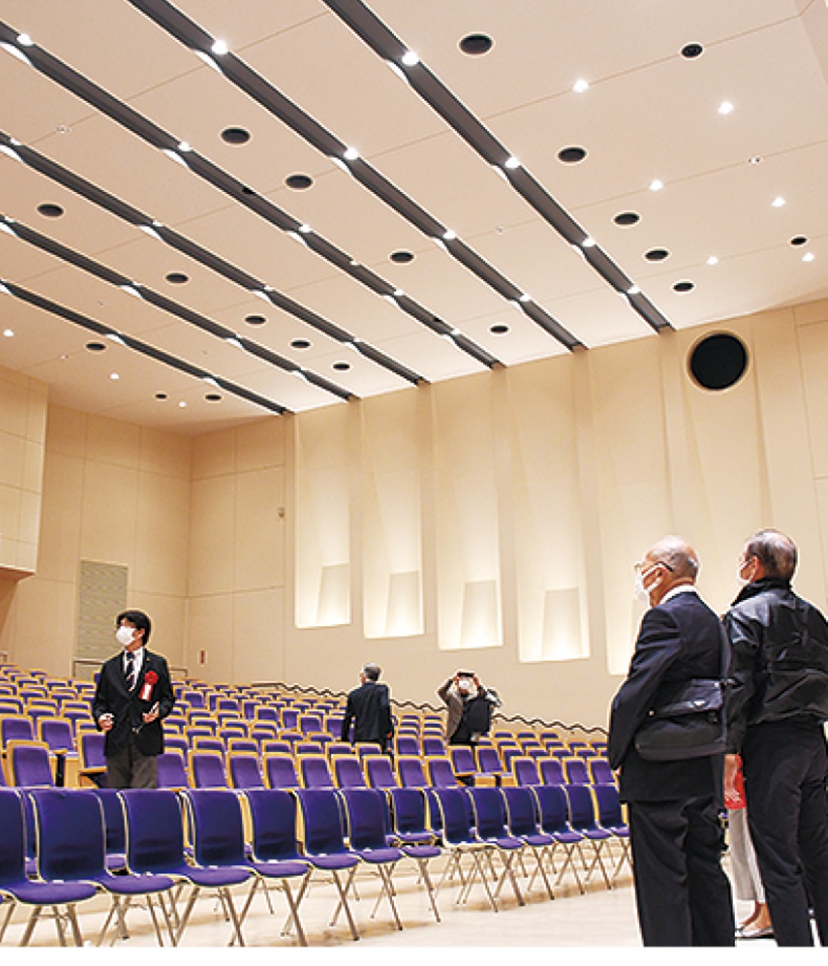 今回のリニューアルは、講堂の天井脱落対策をメインに実施した。照明の8割をLED化、全座席、楽屋、トイレも一新し、施設利用者や出演者らにとって快適な施設に生まれ変わった。