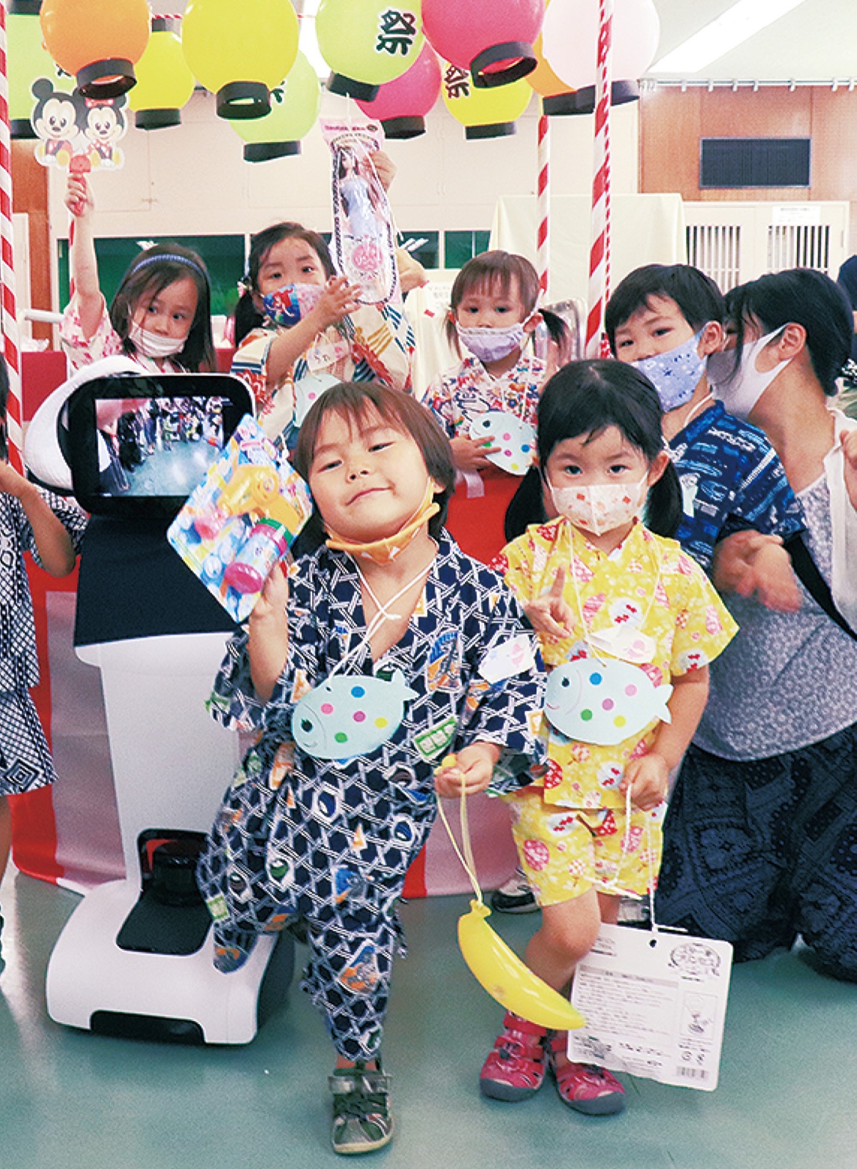 そんな中、今年はさらにロボットのtemi(テミ)が登場した。自走機能を備えるテミを介して、会場の隅々までの様子や音声をオンラインで配信。来場できなかった園児やその家族らは、自宅から画面を通して祭りを楽しんだ。神奈川法人会綱島東支部でのつながりから今回テミを提供した(株)キマキの酒井基宏代表取締役は、「自宅の子どもたちも先生と顔を合わせられて、嬉しそうでよかった」と振り返った。会場では、盆踊りやヨーヨーすくい、ボウリングなど様々なコーナーが目白押し。来場した伊藤悠里ちゃん(2)は「ロボットを使ったゲームが楽しかった」と満面の笑顔を見せた。