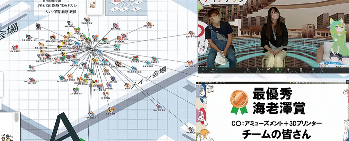 コロナ禍となった今回は、オンライン形式で、計55人が8グループに分かれて参加した。オンライン上には仮想の会場が用意され、参加学生らはアイコンで表示され、会場内を自由に移動し交流できる=写真左。テーマはIoTを用いたファッションやスポーツ分野の課題解決。学生は「通信販売で購入した商品がイメージと異なる」などの課題について議論し、それぞれのビジネスモデルを作り上げた。