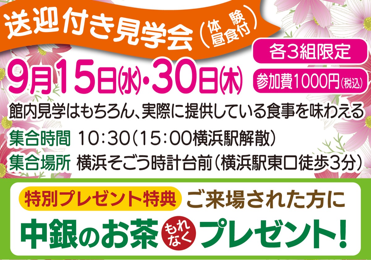 大きな特徴の一つが入居者の自立意識が高い点。毎日を意欲的に生活している人が多く、横浜の中心街へも近いので、現在の住まいと変わりなく都市型の暮らしを続けられる。全室南向きの居室には緊急コールやチェックセンサーを完備。24時間体制で看護・介護職員が常駐するケアセンターもあるので安心だ。施設内はホテルのようなラウンジや大浴場、図書室などの共有設備が充実している。ビリヤードや卓球、囲碁などのサークル活動やカルチャー教室なども多彩。9月15日(水)・30日(木)には送迎付き見学会(体験昼食付)を実施する。応募者多数の場合は抽選。