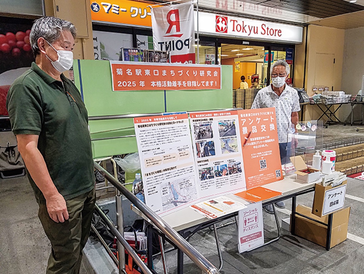 アンケート調査はその一環として行われた。コンサルタントとして関わる(株)山手総合計画研究所の片岡公一さんは「地域の合意形成のため、会員以外の地域住民の意見を広く募る必要があった」と話す。調査は、町内会の掲示板や回覧板、商店街の店舗店頭などで告知され、WEBでの回答フォームと調査用紙を用意。9月10・11日には、同駅改札前にアンケート回収ブースを設置し、回答者以外でも関心のある人には研究会資料が配布された。10日にブース対応を担当した菊名北町町内会の長井貞道会長は「用紙を持参してくれる人が予想以上に多い。資料を持っていく人も多く、関心の高さを実感した」と地域の未来への期待感を口にした。