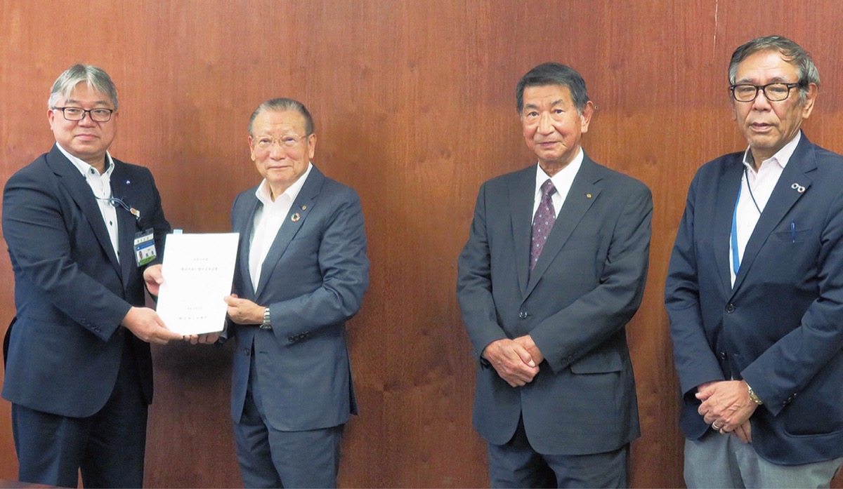 横浜商工会議所北部支部(港北区・神奈川区)の小山正武支部長と中森伸明副支部長、秋本順生副支部長ら5人が9月29日、港北区役所を訪れ、「令和4年度 横浜市政に関する要望書」を鵜澤聡明区長に手渡した=写真(提供)。