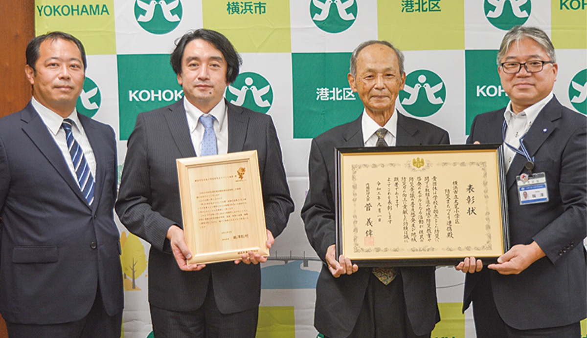 太尾小や周辺自治会らが協力して防災訓練などに取組む「横浜市立太尾小学区防災まちづくり連携」が、今年度の防災功労者内閣総理大臣表彰を受賞。これを受け、地域防災拠点運営委員会の秋本健一本部長と太尾小の館雅之校長、同校PTAの中川譲会長が10月12日、区役所で鵜澤聡明区長を表敬訪問した。
