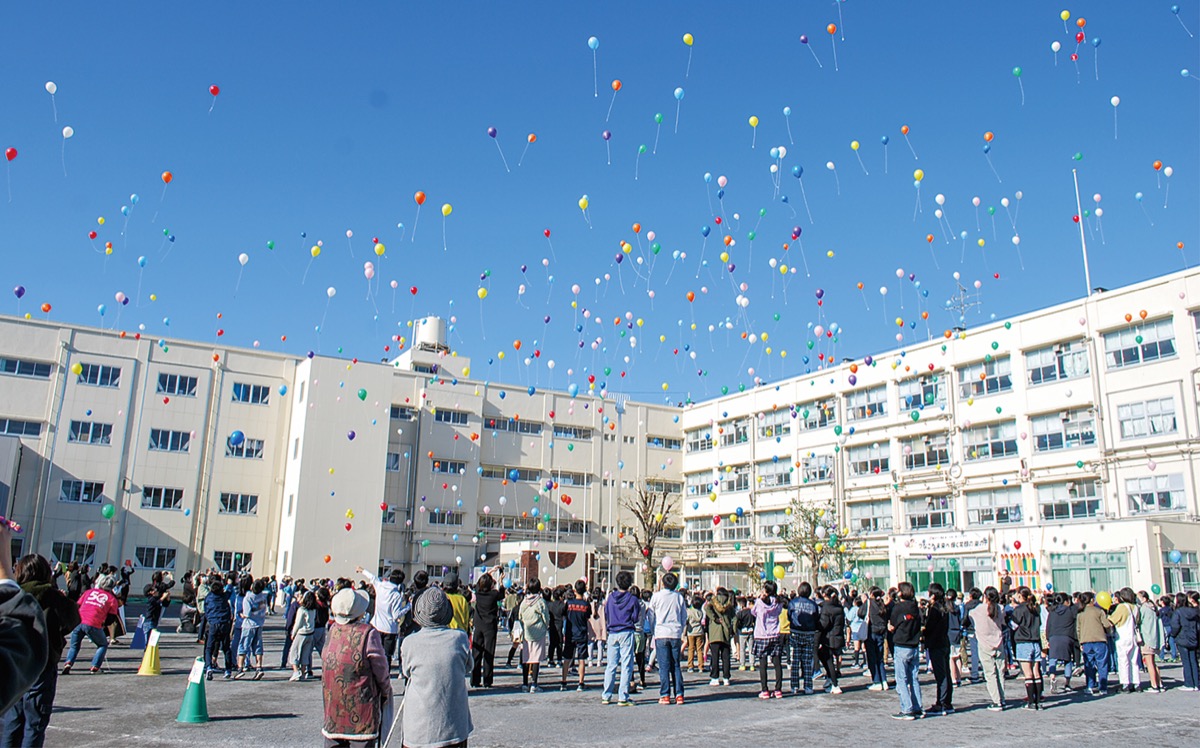 30日の記念式典当日の朝には、午前6時から実行委員会やPTA、親児の会(保護者団体)、教職員らが700個の風船を膨らませ、来場者に配布。「綱島東小の誕生日祝い」として一斉に空へ放つと、歓声と共に児童・地域住民らが風船を見守っていた。