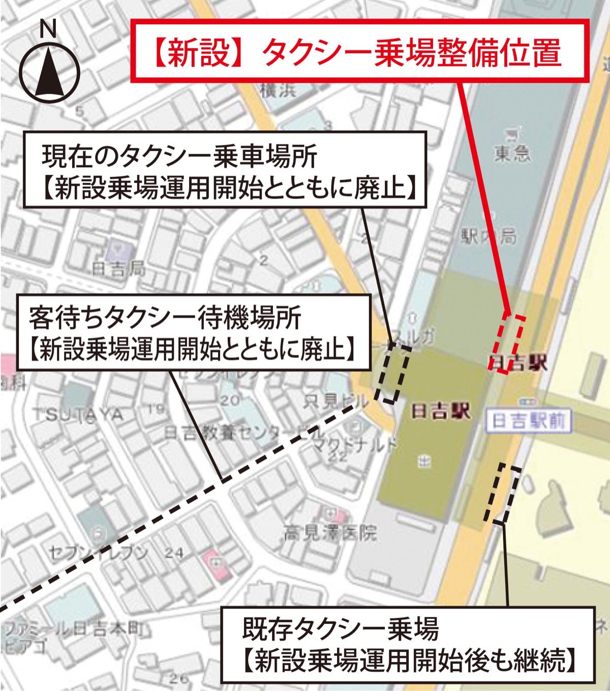 現在、日吉駅前にある西口の乗場は、タクシーを待つ人の列が階段や隣接するスロープ出入口近くにでき、時間帯によっては車椅子利用者らが通行しづらい状況になっている。また、普通部通りで客を待つタクシーによる歩行者の通行阻害も課題となっていた。