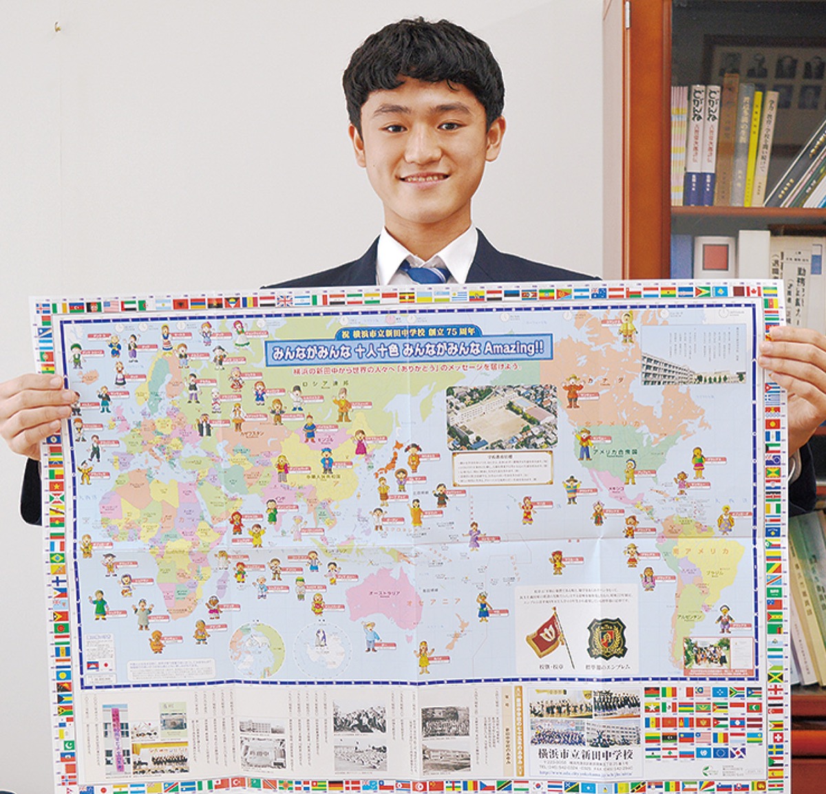 横浜市立新田中学校(簗瀬(やなせ)一爾(かずや)校長)が創立75周年を祝い、記念品として同校の年表などが配された世界地図を製作した。発注費の一部は製作会社を通じて活用され、カンボジアに井戸1基が寄贈されるという。