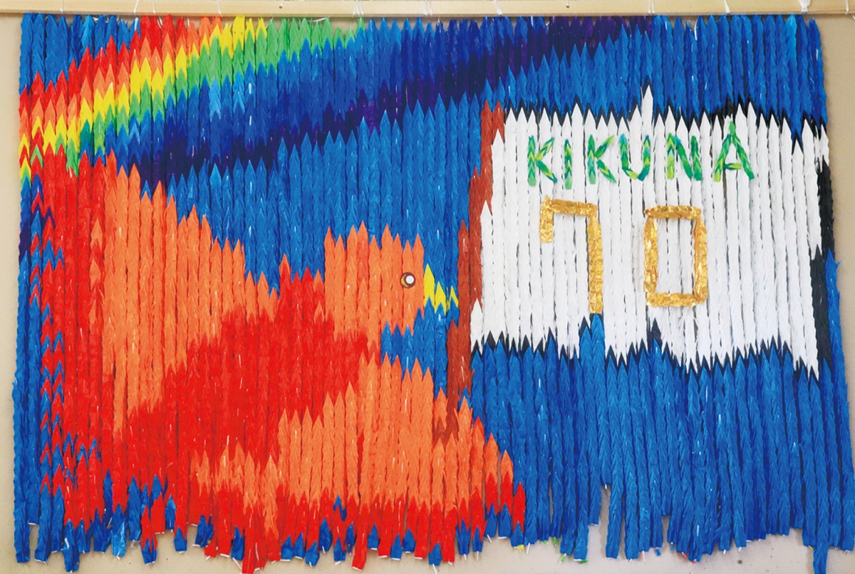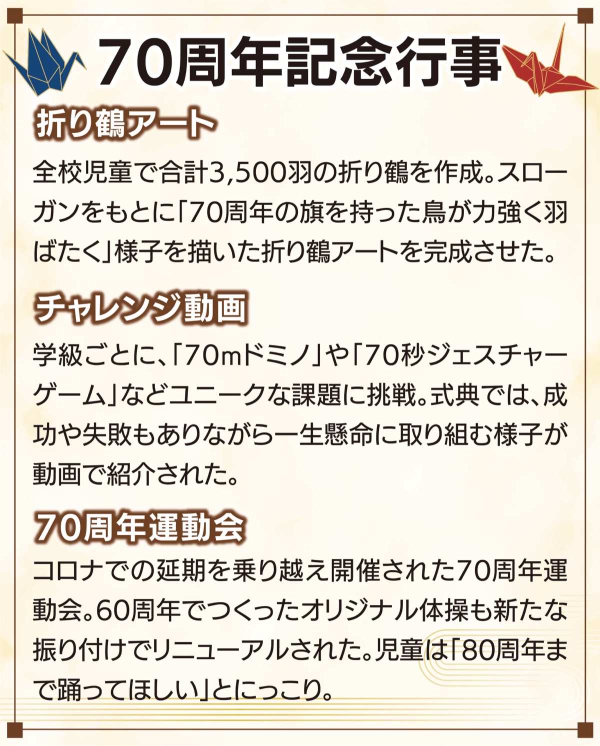 「これからの菊名小へのメッセージ」を発表した6年生は、折り鶴アートや運動会での70周年記念体操も担当。折り鶴の折り方を下級生に教えるなど、最上級生として全校を引っ張っていった。