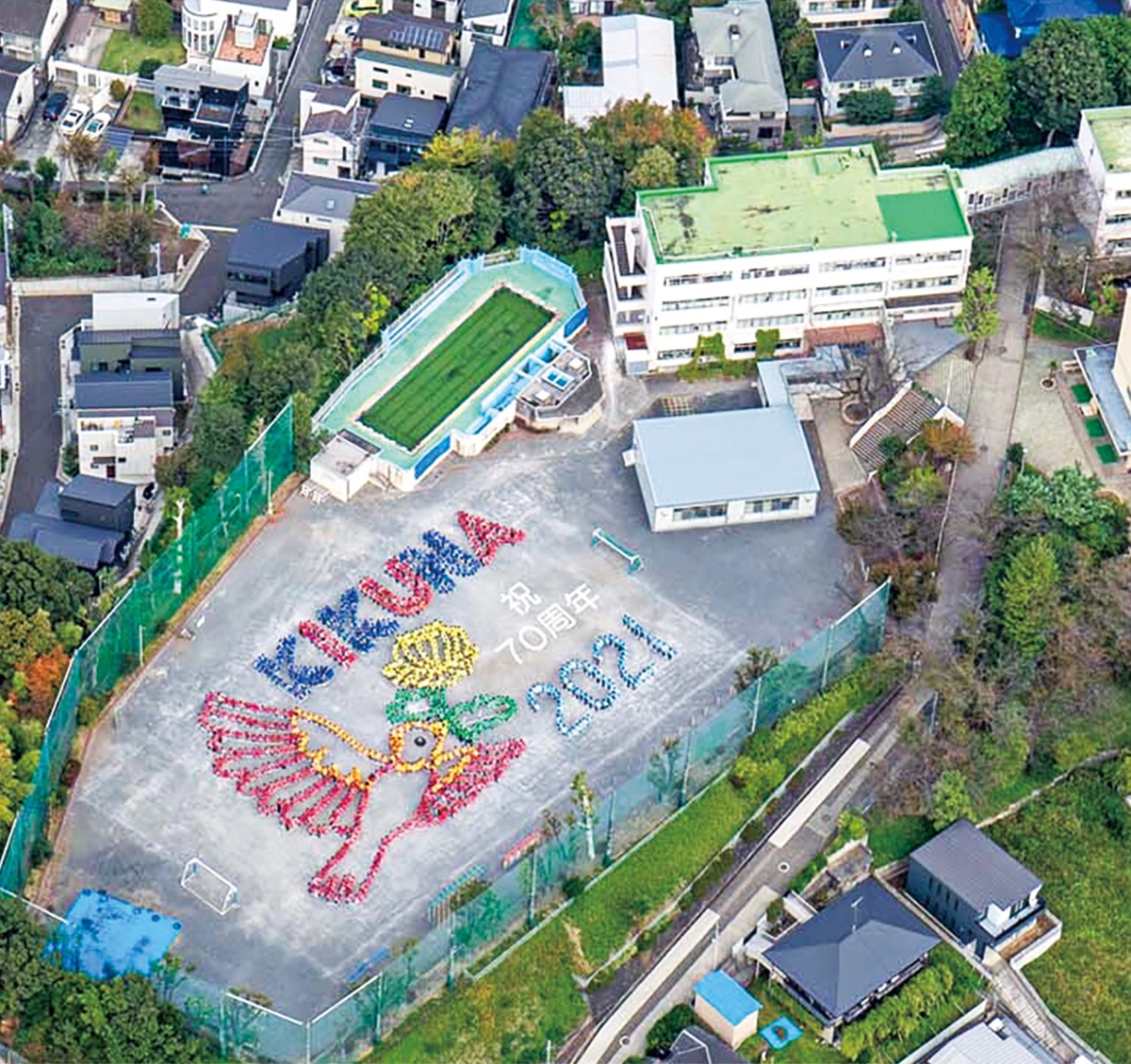 航空写真のデザインは5年生。校歌に登場するヒバリが菊の花を咥え菊名の空を飛ぶ姿を表現。児童は「皆で撮れて嬉しい」と笑顔を見せた。