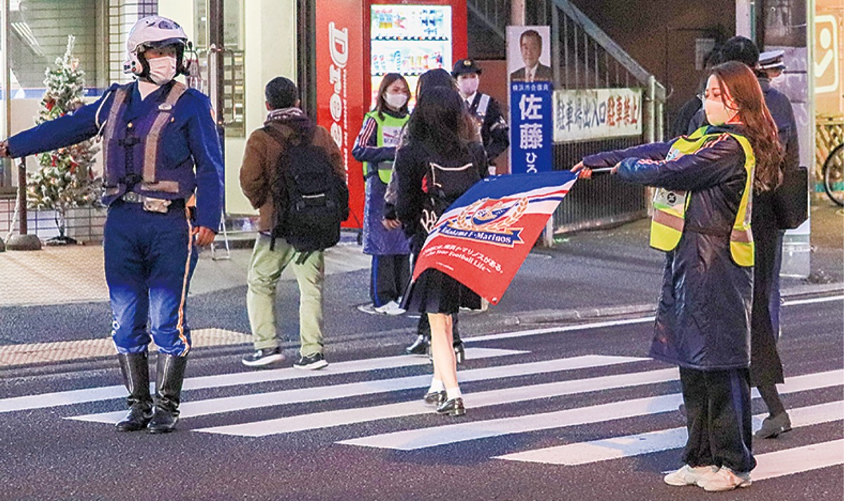 これは12月11日〜20日までの「年末の交通事故防止運動」に合わせて行われたもの。県警本部や港北署の署員に加え、プロスポーツチームとの連携の一環として、横浜F・マリノス公式チアチーム「トリコロールマーメイズ」のメンバー3人も参加。横断歩道を歩行者が通行する際に、クラブのエンブレムが描かれた旗を振ったり声掛けをしたりして、歩行者の安全確保に努めた。