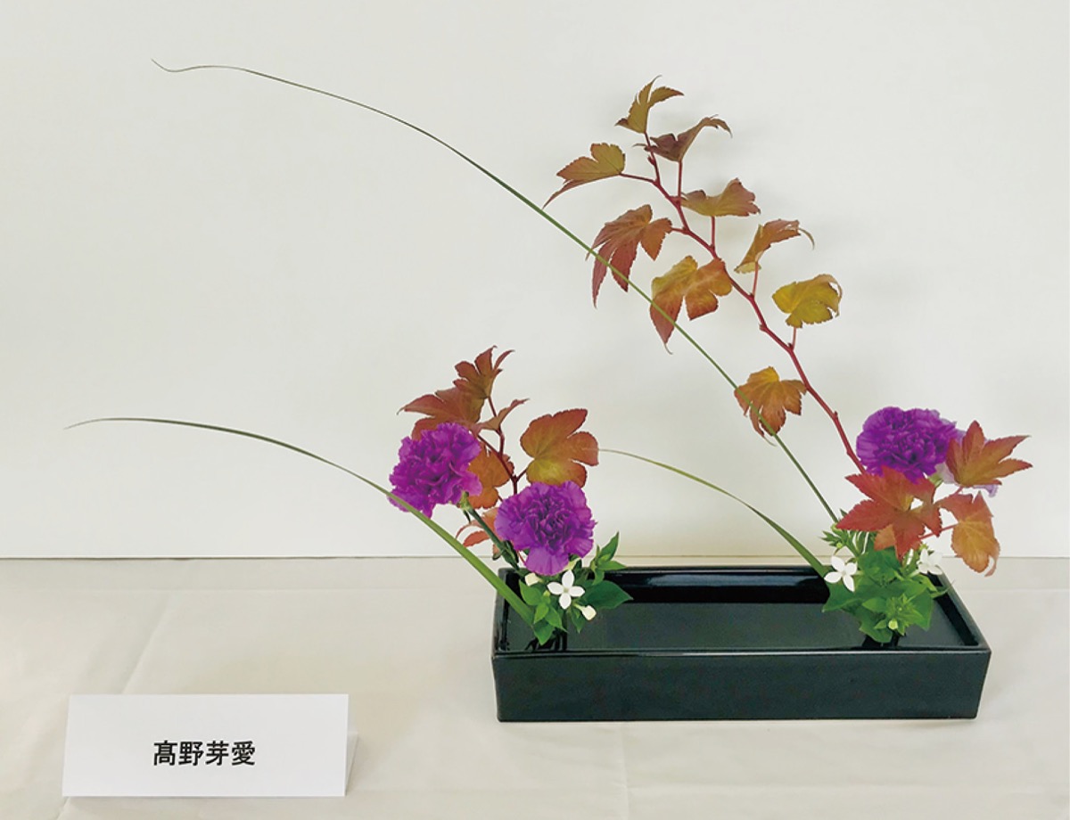 今回の応募作品は「花材選びからこだわり、1週間くらい時間をかけた」という。いつもと違い、二つの剣山を使って空間の広がりが生まれるよう斜め方向に生けたのも新たな挑戦で、3年間の思いを込めた。今も入選に驚いているといい、今後は同じくらい好きな「料理づくり」を極め、栄養士の道に進むことが目標だ。