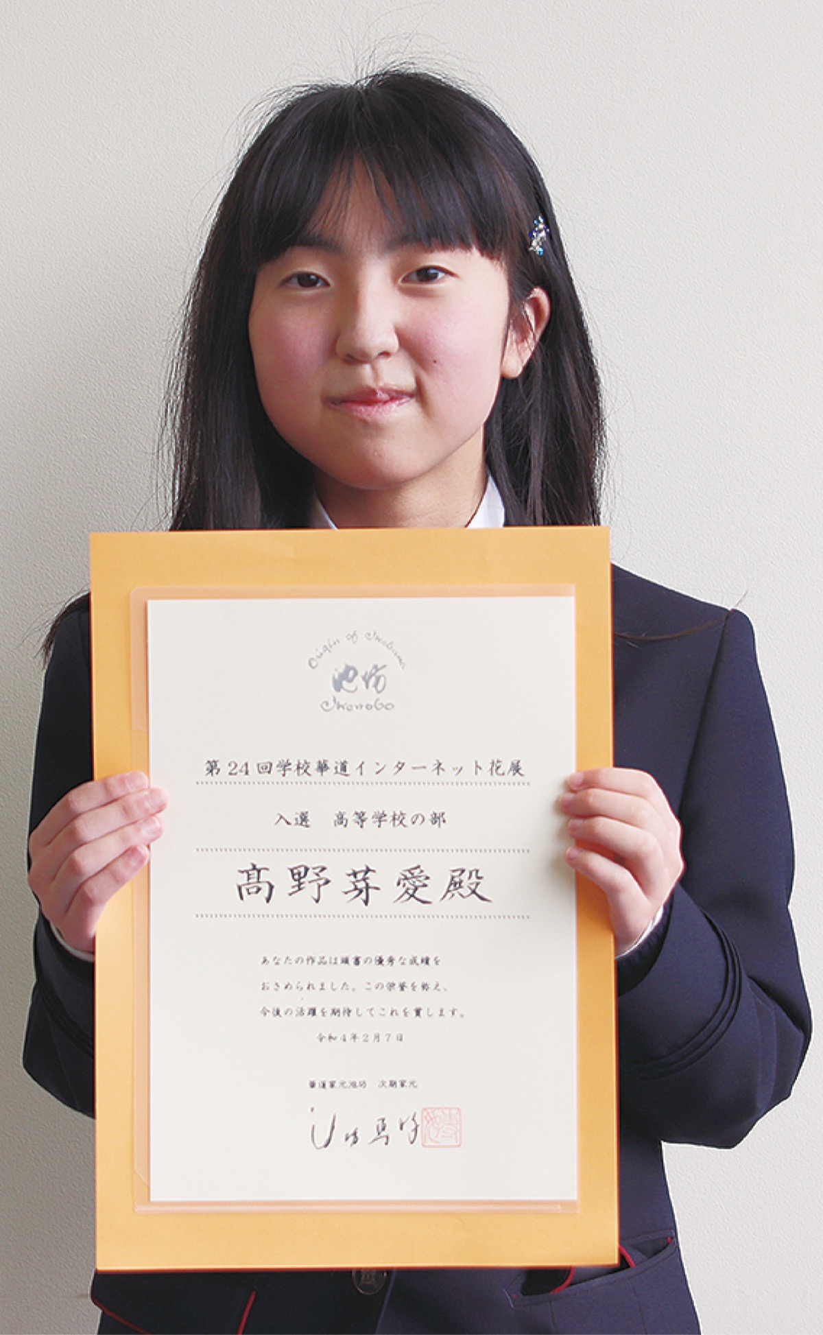 同校1年時に初心者として入部した高野さん。部活動は週1回で、華道講師の講義なども参考にしながら、毎回作品を作ってきた。部活動が高校生活で一番思い出深い、と振り返る。昨年も同展で賞にノミネートされたが、入選には至らなかった。顧問の森田春美教諭も「毎年部として応募し、ノミネート作品はあるが入選は初めて」。