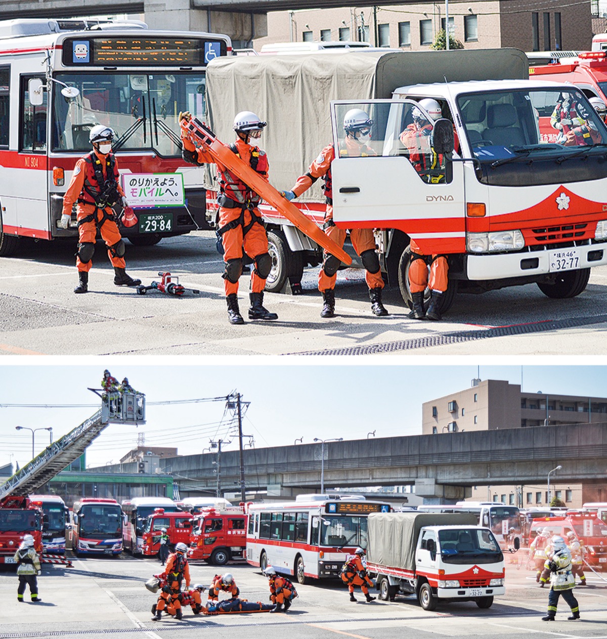 訓練では、乗客を乗せた運行中のバスがジャックされ、トラックと衝突し車両火災が発生したことを想定。