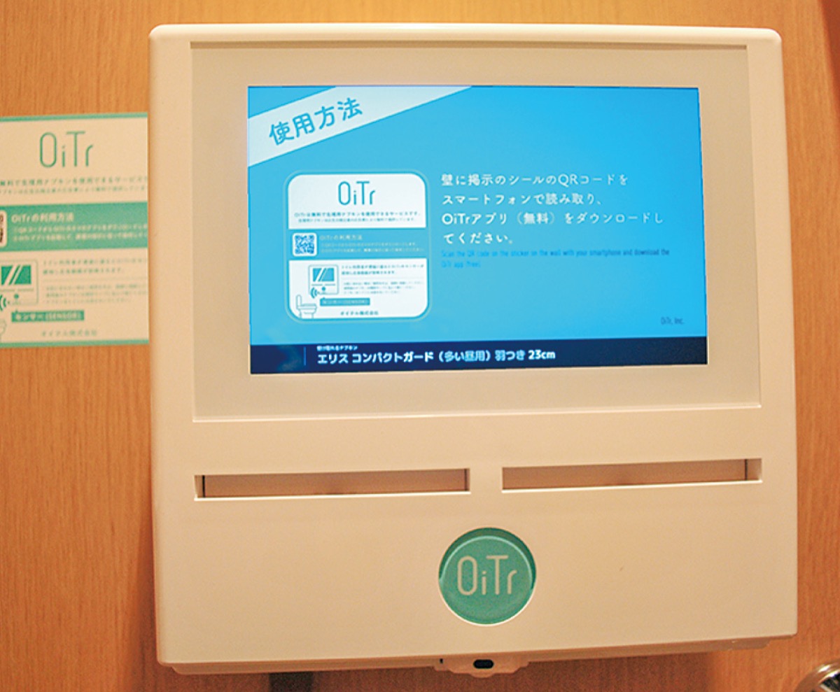 師岡町の商業施設、トレッサ横浜では、北棟2階のリヨン広場奥にある女性用トイレで生理用ナプキンの無料提供をこのほど開始した。これは、オイテル(株)が提供するサービス「OiTr(オイテル)」を導入したもの。掲示された二次元コードからアプリをダウンロードし、起動後に画面の取り出しボタンをタップし、スマートフォンを専用ディスペンサーに近づけると取り出し口から生理用ナプキンが提供される。ナプキンの費用は、ディスペンサーのディスプレイに広告掲載するスポンサーからの広告料で賄われるという仕組みだ。