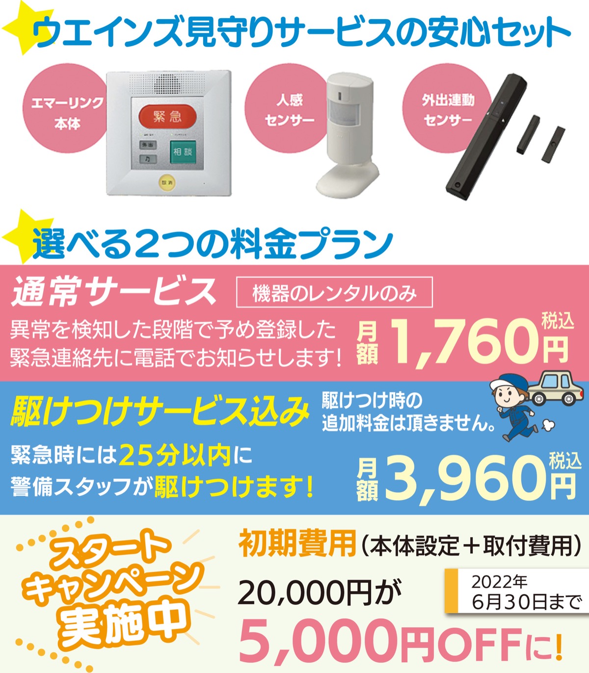 自宅の固定電話にハンズフリーで通話ができる緊急通報装置を設置。24時間365日、いつでも専門スタッフと通話が可能。自宅に設置したセンサーで外出の有無を確認したり、室内で身動きが取れなくなった時など、一定時間人の動きを検知しなかった場合に自動通報を行ってくれる。緊急時の対応は、警備スタッフが「迅速に自宅まで駆けつける」ほか、登録している家族へ電話で知らせるなど、各家庭の状況に応じてプランが選べる。また緊急時だけでなくボタン一つで看護師と通話でき、健康相談や病院案内も行っている。