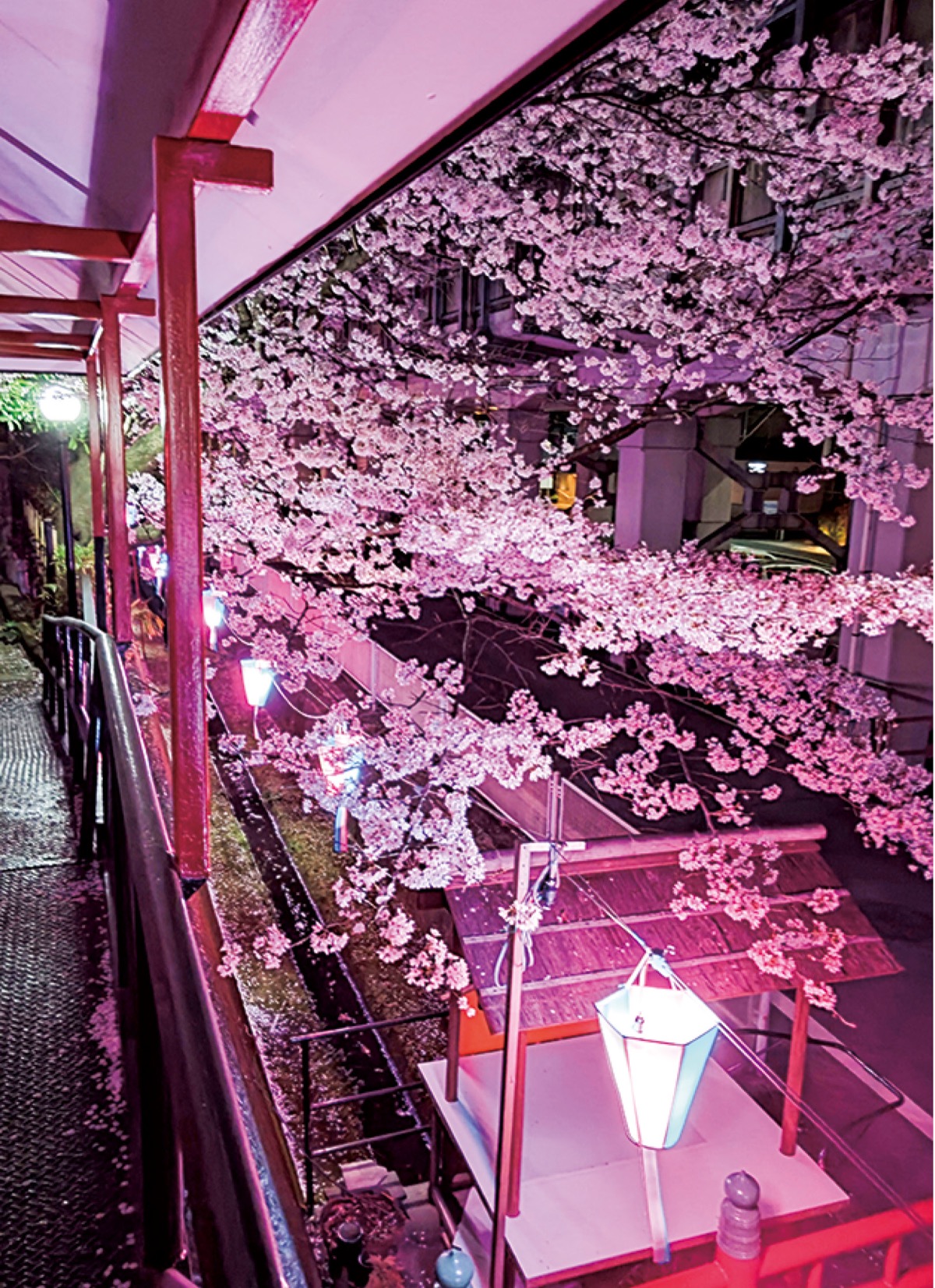 期間中は、店前の川沿いに咲く桜7〜8本に沿って、提灯が飾り付けられた。